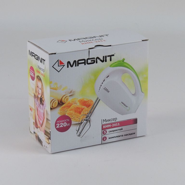 Миксер Magnit RMM-2411 - легкий и компактный прибор с пятью скоростями. Есть два варианта насадок, которые легко вынимаются для мытья (механизм-защелка). При использовании венчиков миксер энергично взбивает легкое тесто (блинное, безе и т.п.) или крем, а насадки-крюки справляется с жидким тестом в небольших объемах. Надежные венчики и крюки полностью изготовлены из нержавеющей стали.