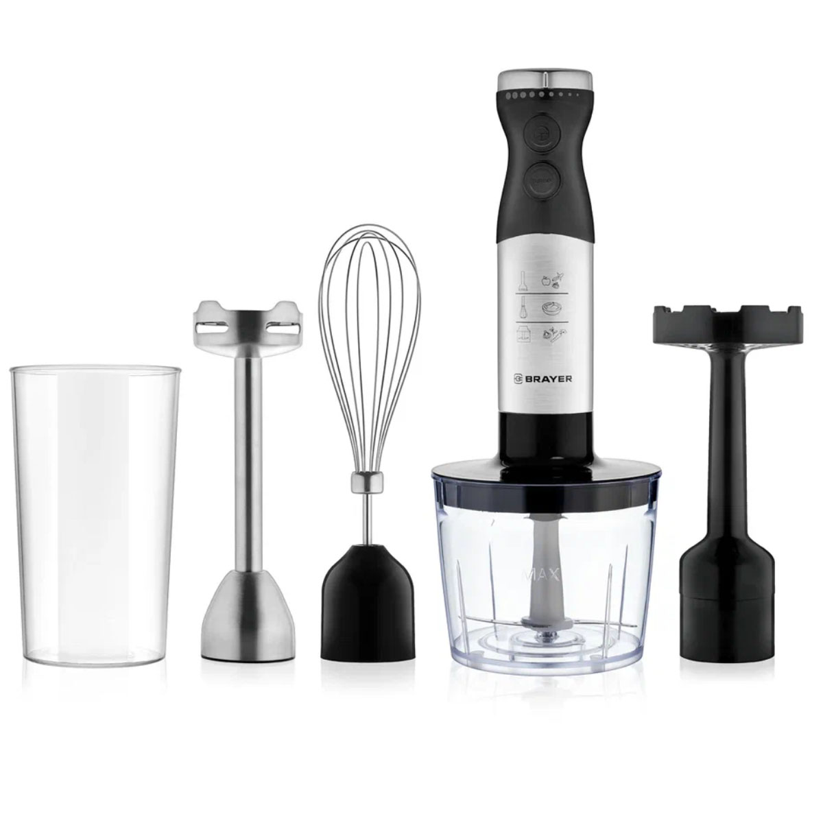 Блендер погружной эл. BRAYER  BR1244, погружн., 800Вт, 4 в 1, насадка д/пюре, плавн.рег.скорости, венчик, стакан 700мл., нерж.