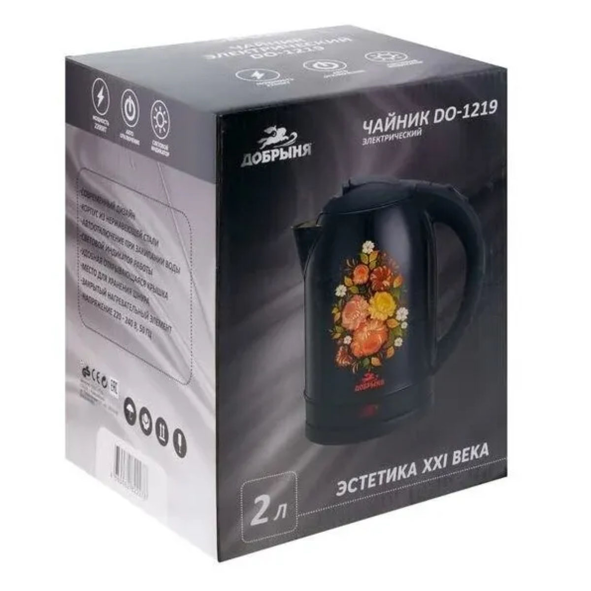 Чайник эл. ДОБРЫНЯ "Хохлома" DO-1219, нерж 2,0л 2200Вт, световой индикатор работы, черный