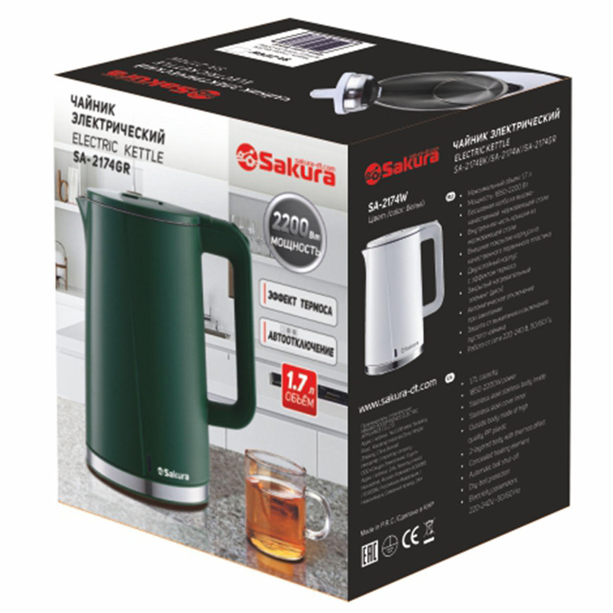 -Эл.чайник SA-2174GR 1,7л малахит нерж/пластик