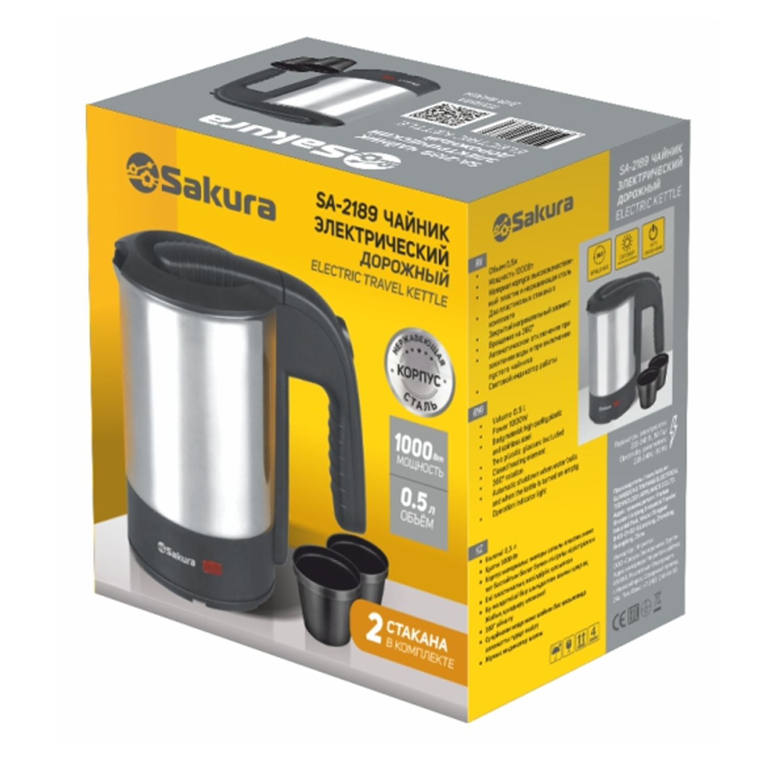 Эл.чайник SA-2189 дорож. (0,5л) нерж с 2 стаканами