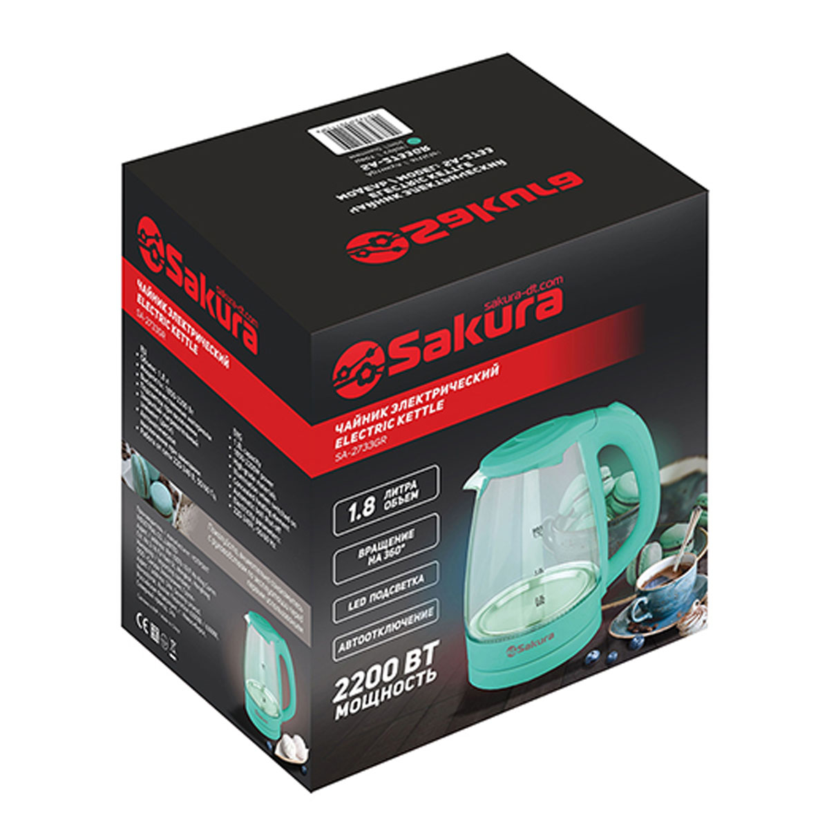 Чайник эл. SAKURA SA-2733GR, 1,7л,2200Вт,стекло,LED подсветка