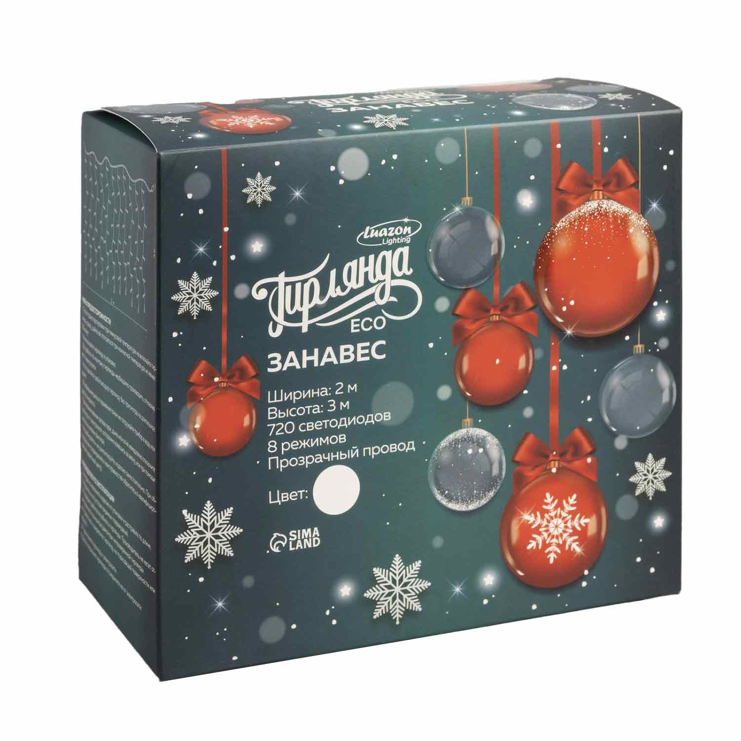 ЗАНАВЕС ECO. IP20, УМС вилка, Ш:2 м, В:3 м, Н.С. LED-720-220V, 8 режимов, БЕЛЫЙ 1080471