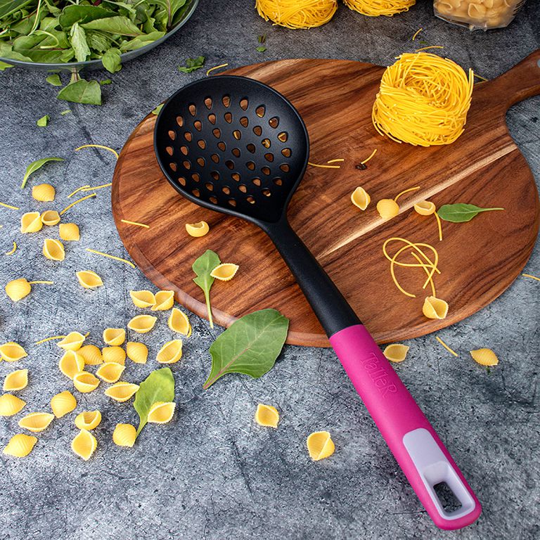 Шумовка TalleR TR-51490 — надежный кухонный инструмент длиной 35 см, изготовленный из безопасного термостойкого пластика, выдерживающего температуру до 210°C. Яркий дизайн с черным корпусом и розовой ручкой делает шумовку стильным и удобным аксессуаром на вашей кухне.
