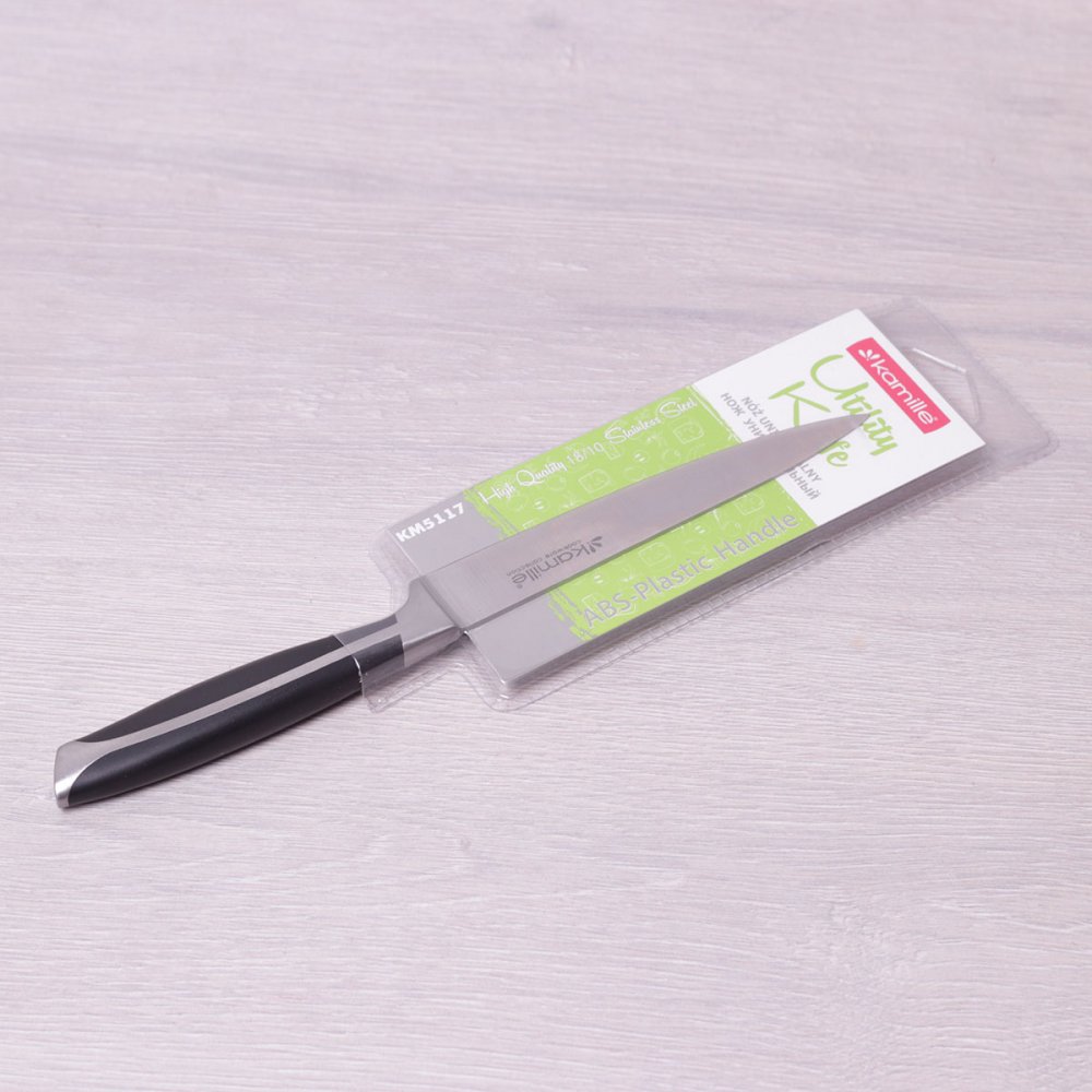 Нож Kamille 5117, универсальный. Материал лезвия: нержавеющая сталь. Длина лезвия: 12.5см. Заточка лезвия: односторонняя. Материал рукоятки: ABS-пластик. Длина рукоятки: 11см
