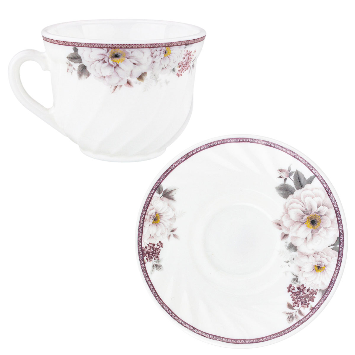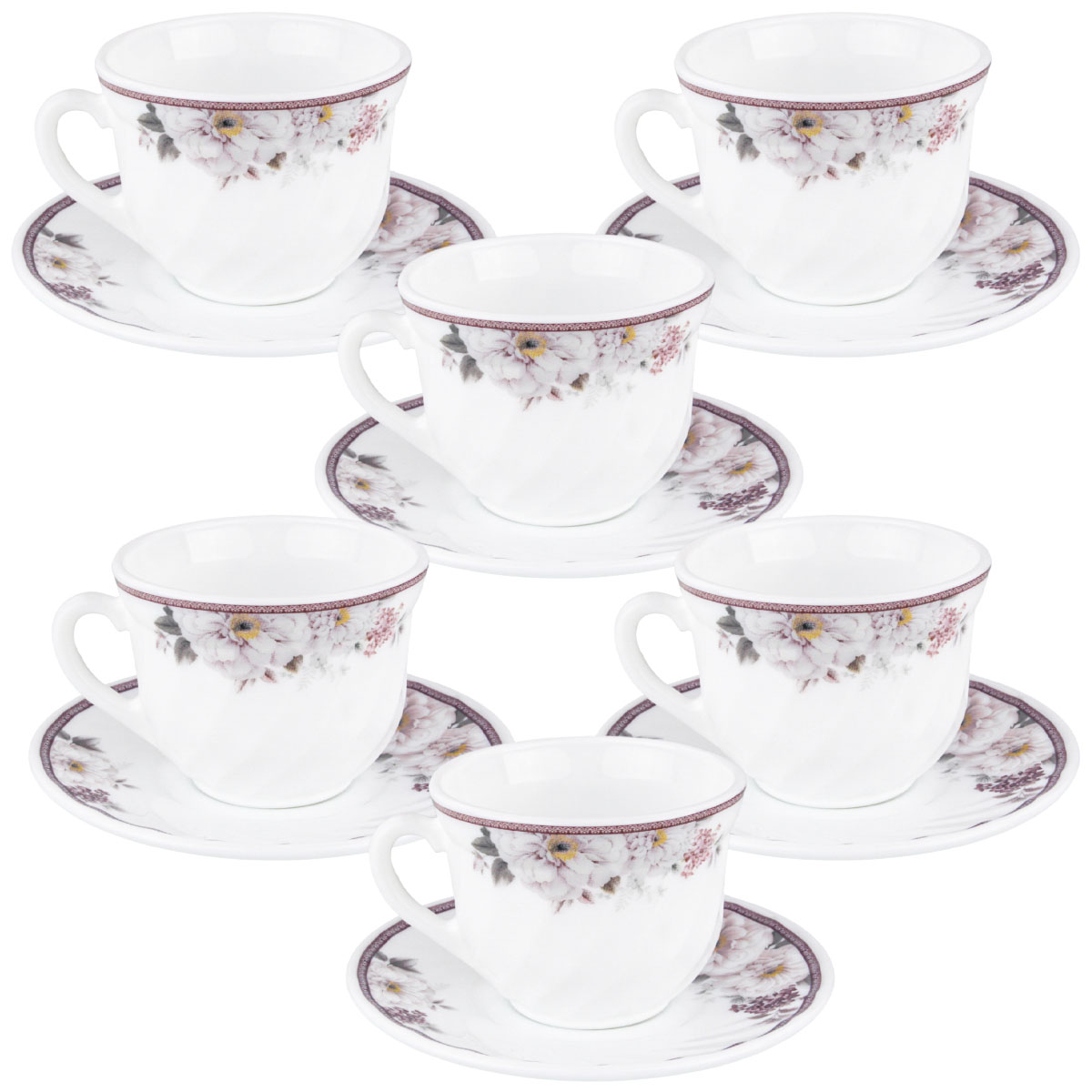 Набор чайный стеклокерам. Torix "Горный пион" XWB190T-12/16092, 12 пр.(кружка 190мл.-6шт, блюдце 14см-6шт), белый с декором