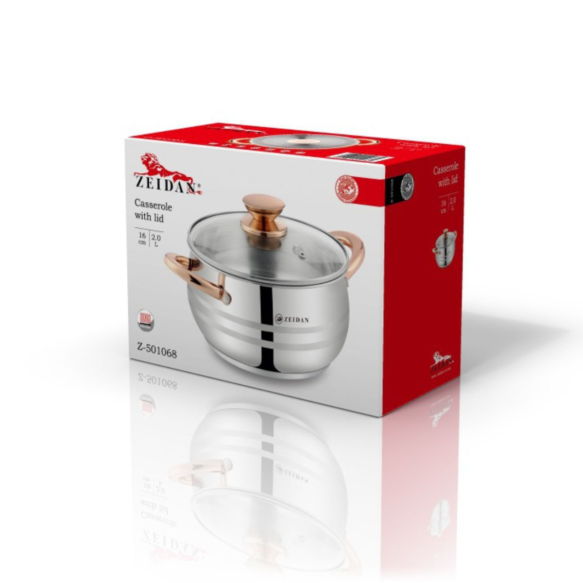 Кастрюля нерж. ZEIDAN Z-501068, 2.0л, 16см, стекл.кр., индукц. дно, ручки под золото, п/у