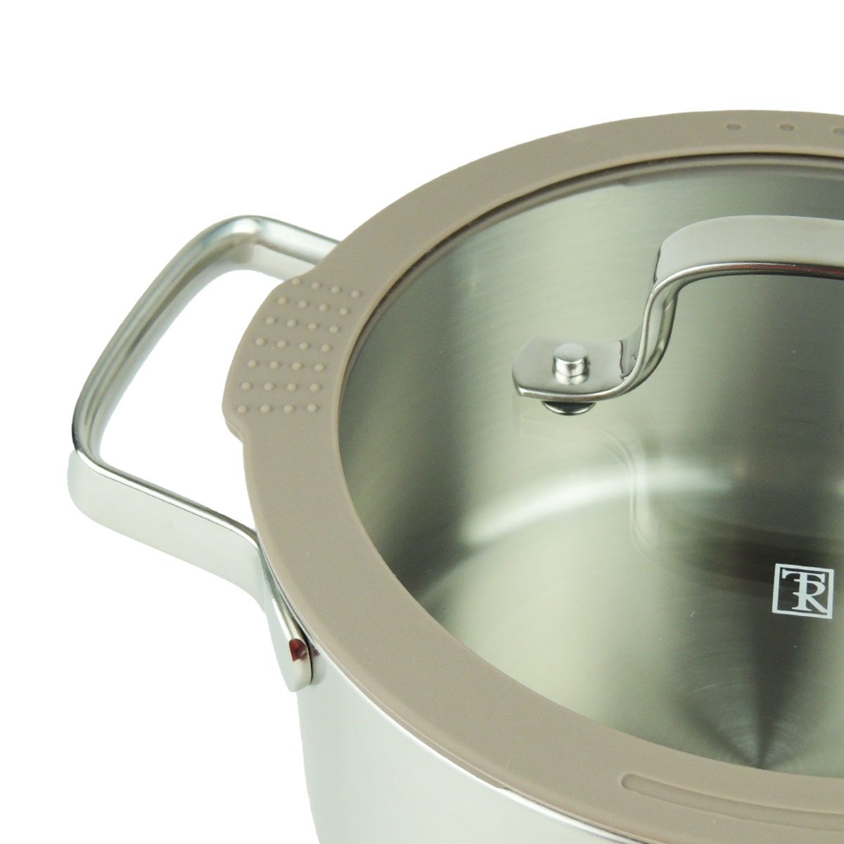 Особая конструкция комбинированной крышки из закалённого стекла с силиконовым ободом светло-коричневого цвета обеспечивает удобный слив жидкости через отверстия, а также эффективный выход пара. Силиконовый обод защищает посуду и кухонные поверхности от сколов и царапин, а также делает закрытие кастрюли бесшумным. Ручки из нержавеющей стали закреплены точечной сваркой, что повышает надежность и удобство эксплуатации. На внутренней стенке есть отметки литража для контроля объема.