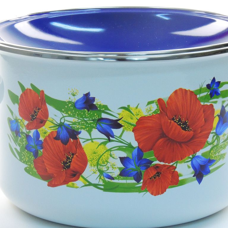 Набор посуды эмаль НОВОКУЗНЕЦК "Майский день" N15B85, 3 предмета, 2л., 3л., 4л., крышка цветная эмаль, ручки литые, с декором, бело-синий