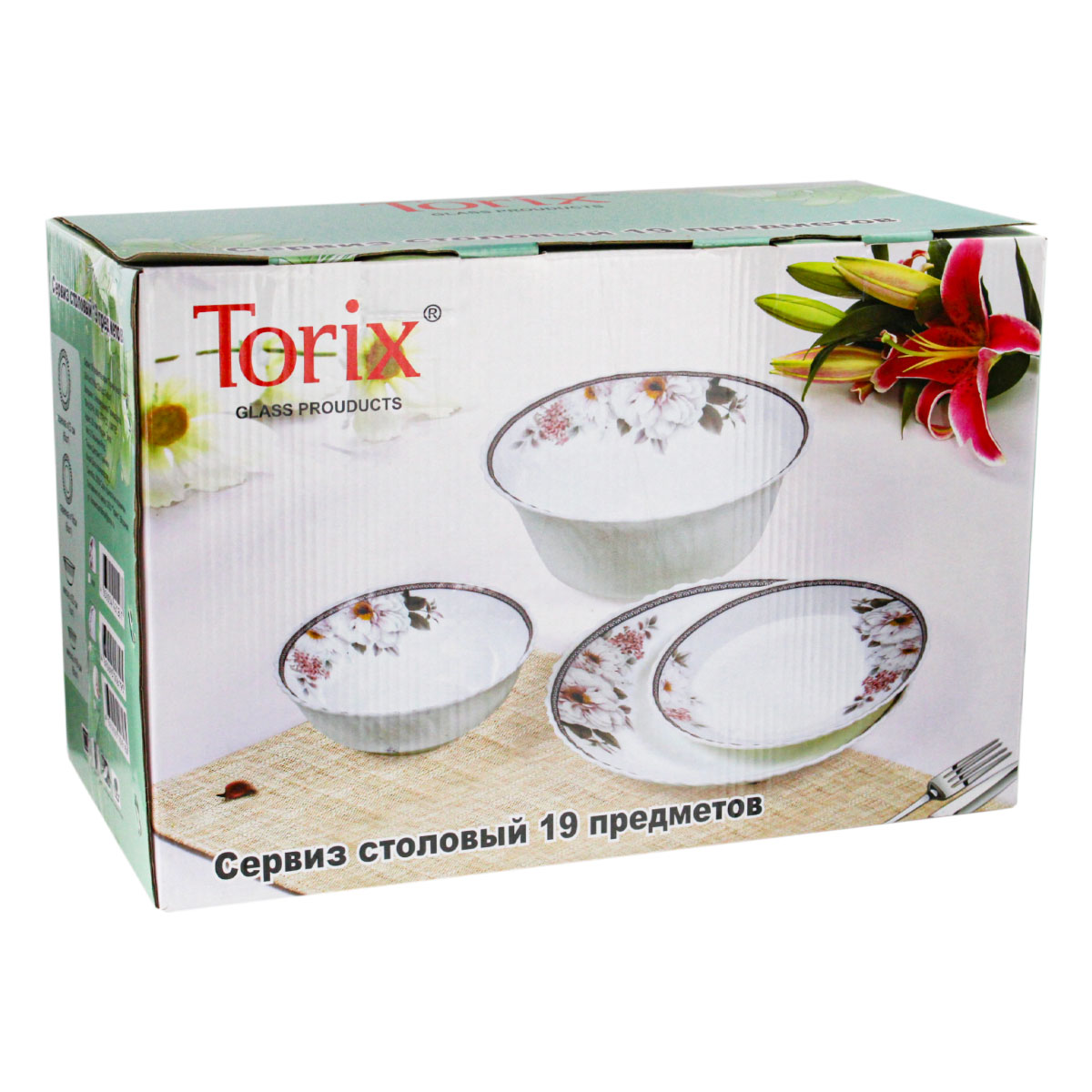 Сервиз столовый стеклокерам. Torix "Валенсия" NH19OT/12148, 19 пр.(тарелка: 23см.-6шт, 18см.-6шт, салатник 23см.-1шт, 17см.-6шт), белый с декором